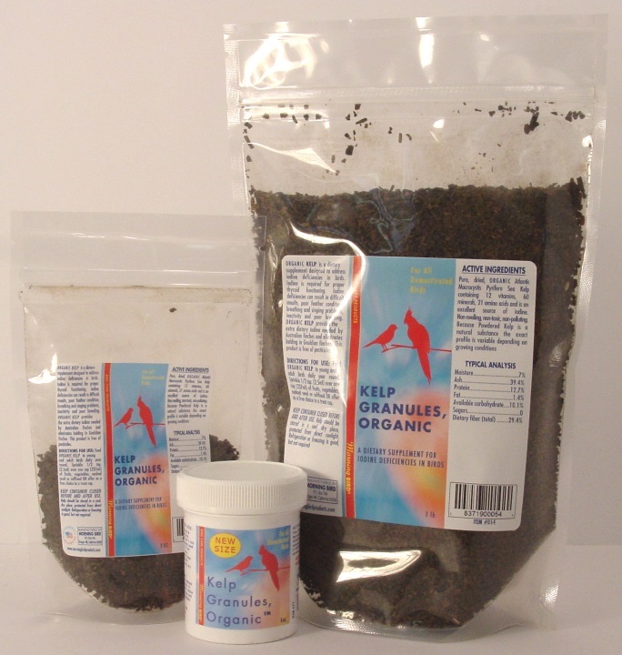 KELP GRANULES is a dietary supplement designed to address iodine deficiencies in birds. Iodine is required for proper thyroid functioning. Iodine deficiencies can result in difficult moults, poor feather condition, breathing and singing problems, inactivity and poor breeding. Kelp Granules provides the extra dietary iodine needed by Australian finches and eliminates balding in Gouldian finches.