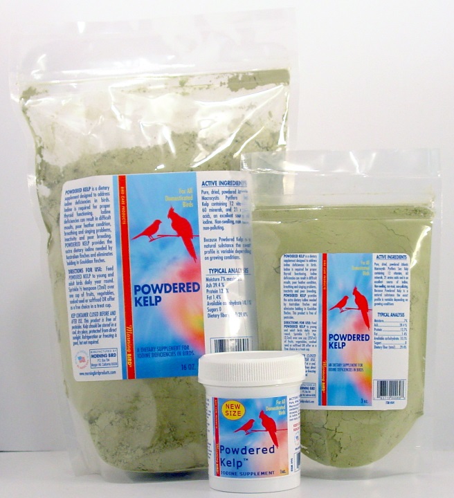 POWDERED KELP is a dietary supplement designed to address iodine deficiencies in birds. Iodine is required for proper thyroid functioning. Iodine deficiencies can result in difficult moults, poor feather condition, breathing and singing problems, inactivity and poor breeding. POWDERED KELP provides the extra dietary iodine needed by Australian finches and eliminates balding in Gouldian finches.